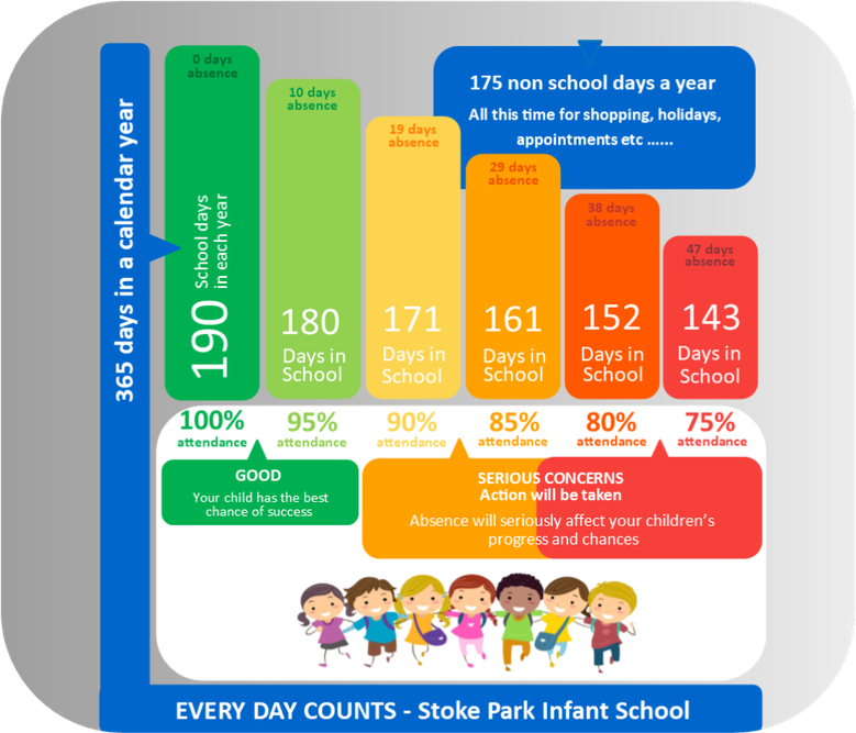 It is very important that children attend school every day and do not take holiday in term time. Good attendance for every child should be at 96%+. We recognise that all children have illnesses and cannot attend school on these days. As a school we promote good attendance and work with families who may find this difficult.