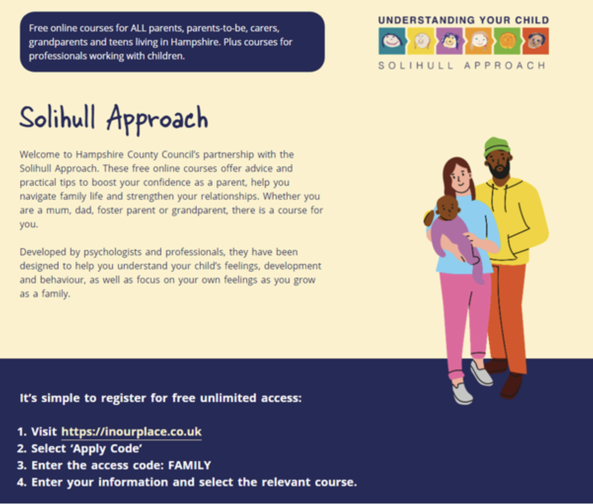 Hampshire County Council has partnered with the Solihull Approach to provide free, evidence-based online courses with practical tips and advice to boost parents' and carers' confidence, help them navigate family life, and strengthen their relationships. Whether you are a mum, dad, foster parents or grandparent, there is a course for you. Once registered, families receive unlimited access to the courses and can go back to them as their children grow. The interactive courses cover topics like: