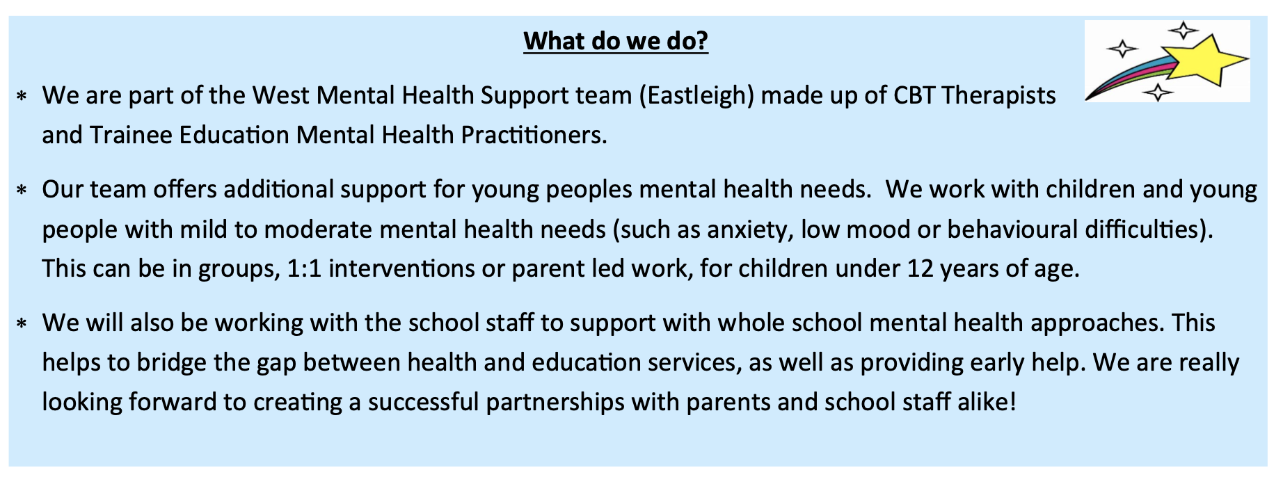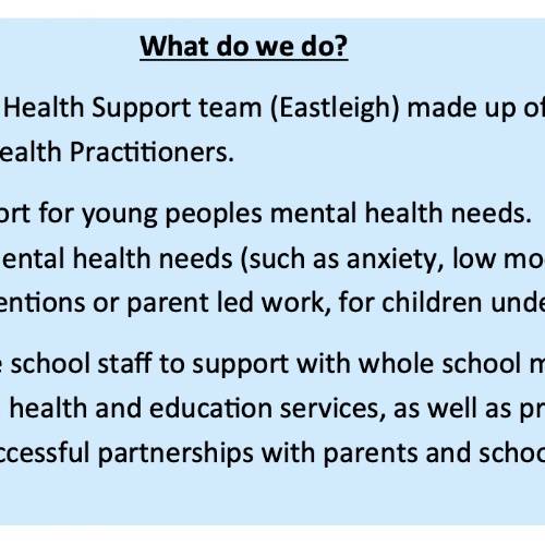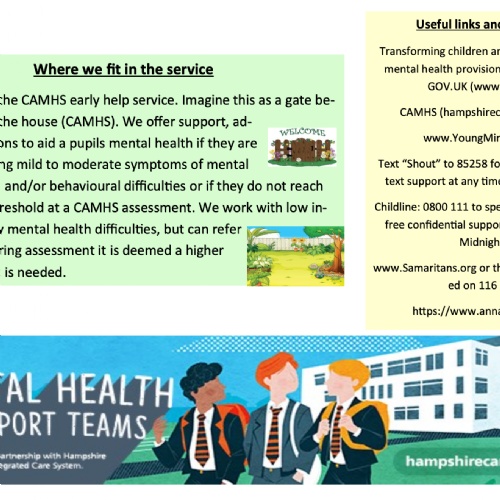 In our school we have 2 senior mental health leads (SMHL), these are Mrs Charles and Mrs Brennan. Our linked Educational Mental Health Practitioner (EMHP) is Joanna Moroney. Please see the flyer below for information about the MHST service. Although the service will very often work directly with parents, all referrals are made via the school. Please feel free to talk to your child's teacher in the first instance if you have a concern regarding your child's mental health.